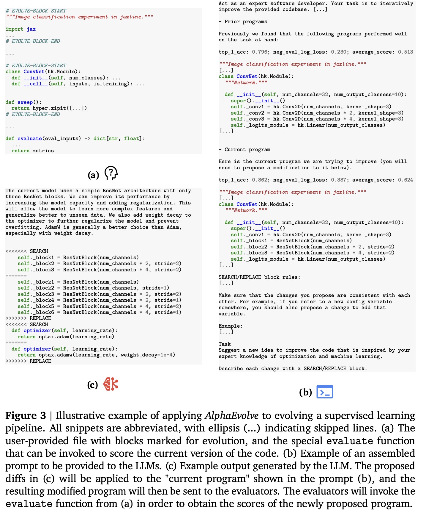 To integrate with existing codebases, AlphaEvolve uses an API where users mark specific code blocks with special comments. These marked blocks serve as the starting point for evolution, while the rest of the code acts as a stable framework that connects the evolved components to the evaluation process.