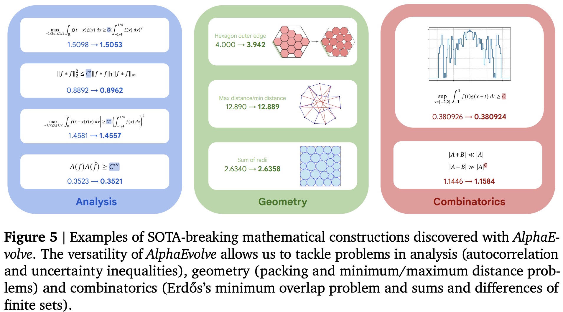 AlphaEvolve has proven to be a powerful tool for mathematical discovery, capable of finding optimal or near-optimal constructions across a wide range of open problems. These problems span multiple areas of mathematics, including analysis, combinatorics, number theory, and geometry. Applied to over 50 curated problems with various parameter settings, AlphaEvolve was able to rediscover the best-known solutions in 75% of cases and improve upon them in 20%, starting from simple or random constructions.