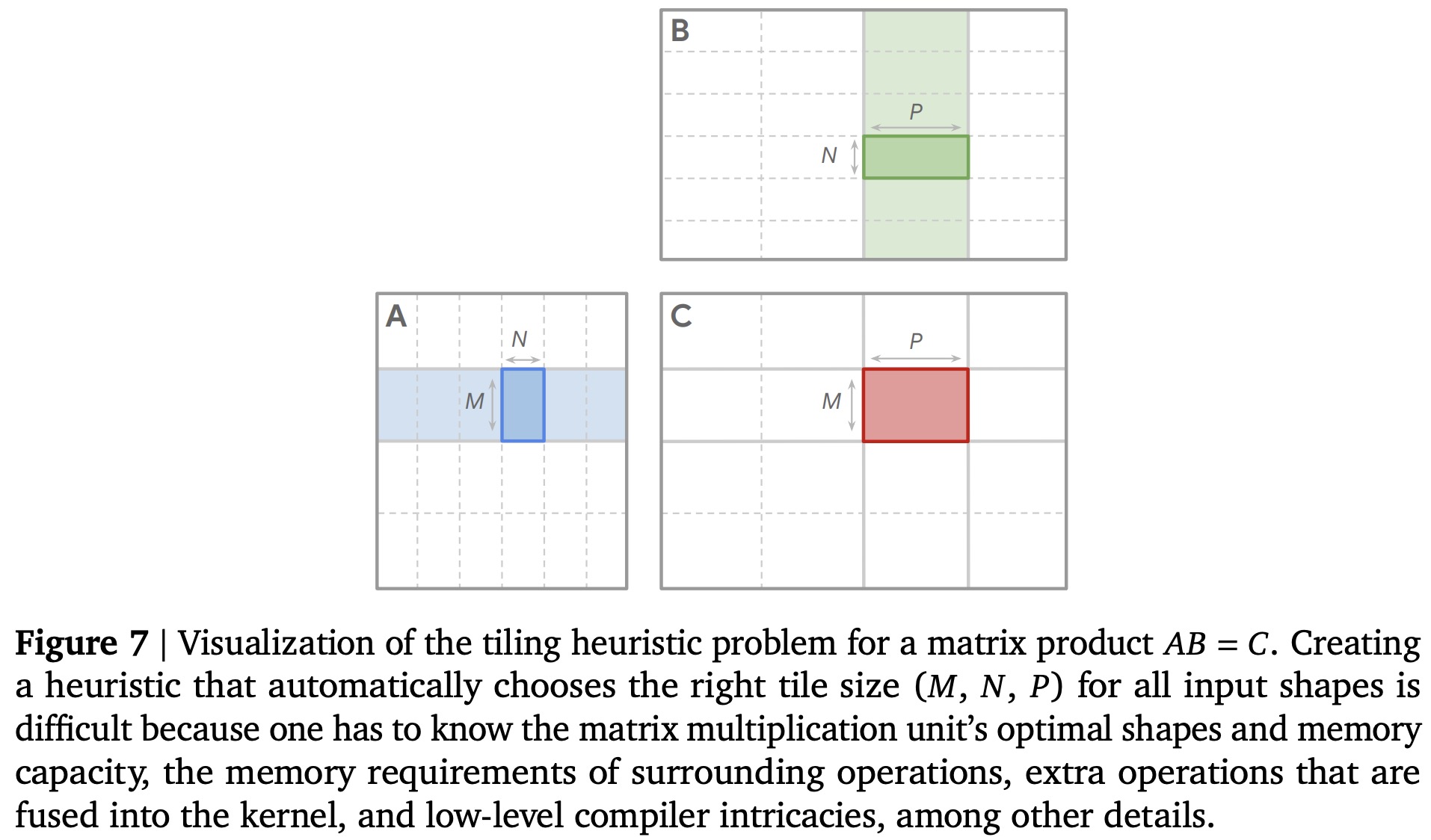 Training large models like Gemini requires efficient kernel execution, especially for matrix multiplication. These operations rely heavily on tiling strategies, which split large computations into smaller chunks to improve performance on hardware accelerators. Traditionally, these tiling heuristics are either manually designed (requiring deep hardware expertise) or autotuned through costly and time-consuming searches.