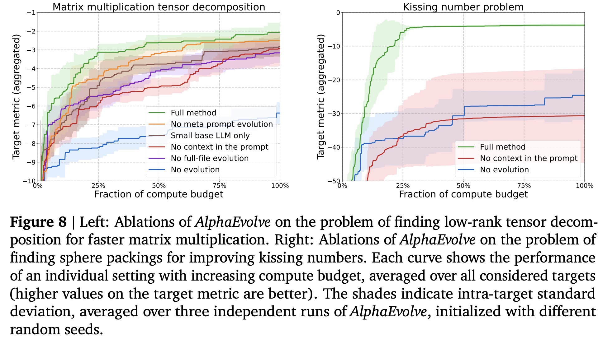 The results showed that each component contributes significantly to AlphaEvolve’s performance. Removing any of them led to noticeably worse outcomes, highlighting the importance of the evolutionary process, rich context, meta-prompting, full-code evolution, and the use of diverse, powerful LLMs.