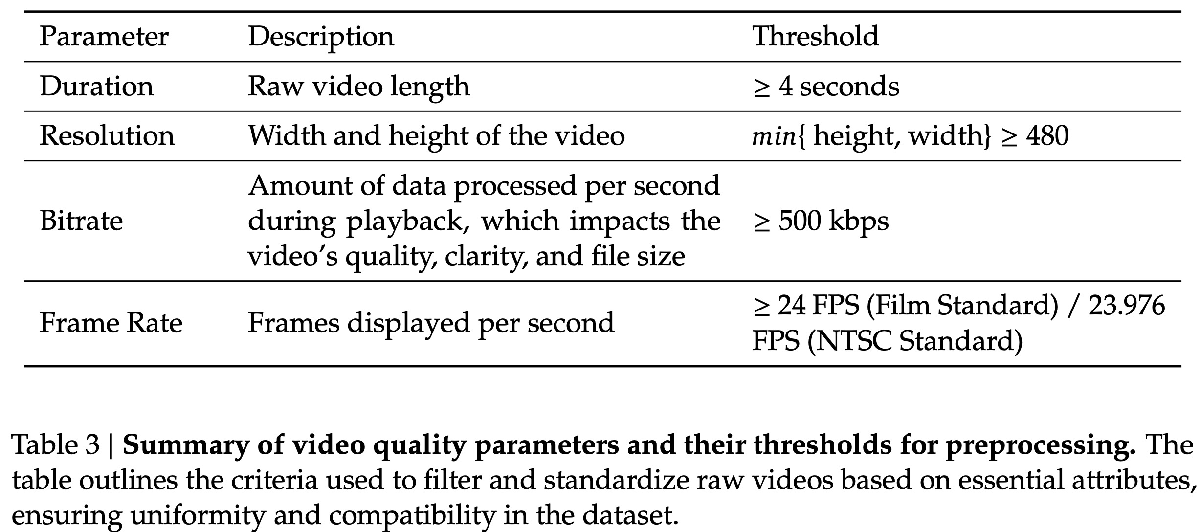 - Video Preprocessing and Standardization: The videos are filtered out using the criteria above and standardized to a consistent coding format H.264.