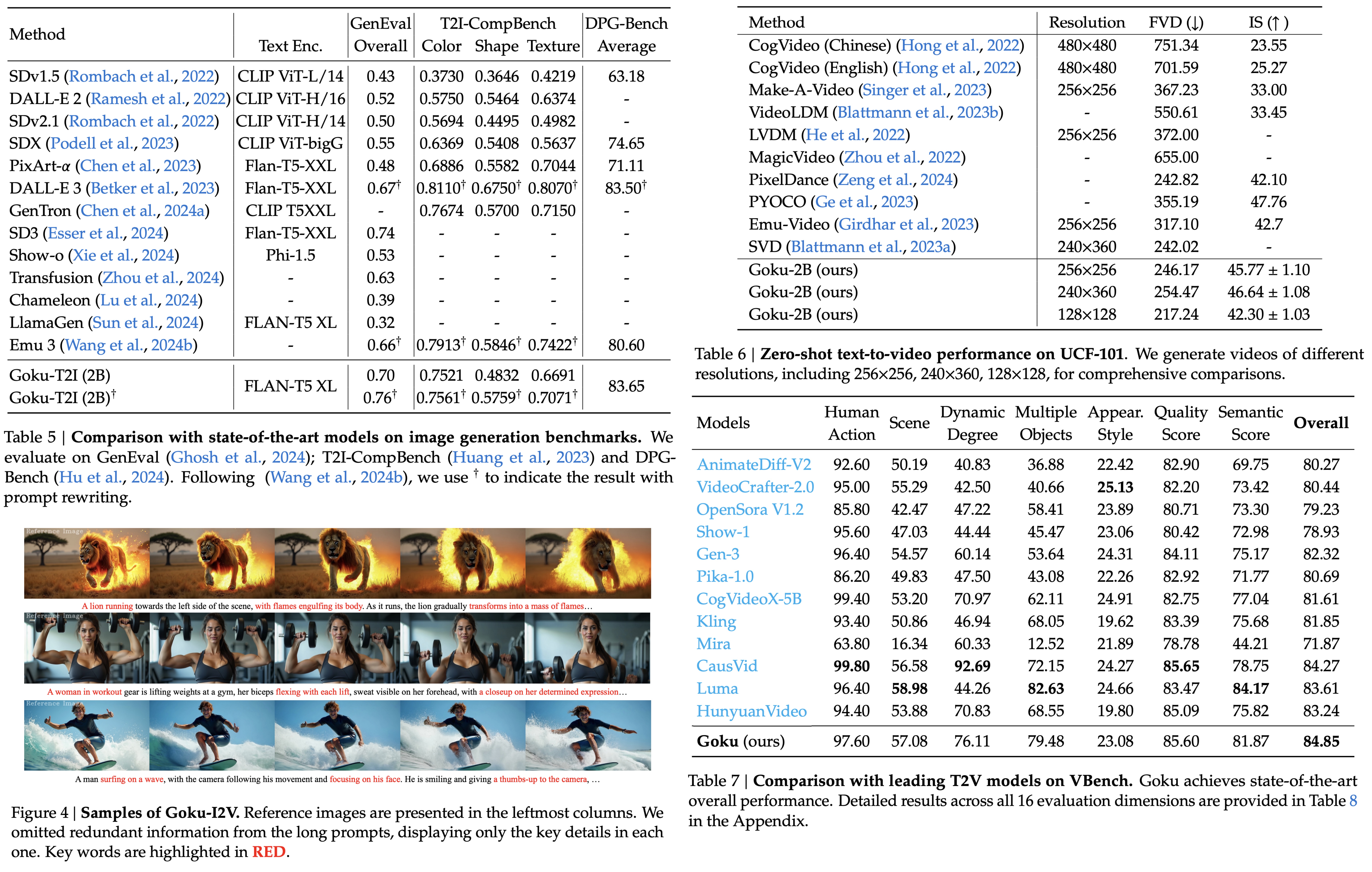 Goku achieves state-of-the-art performance in both text-to-image and text-to-video generation across multiple benchmarks.