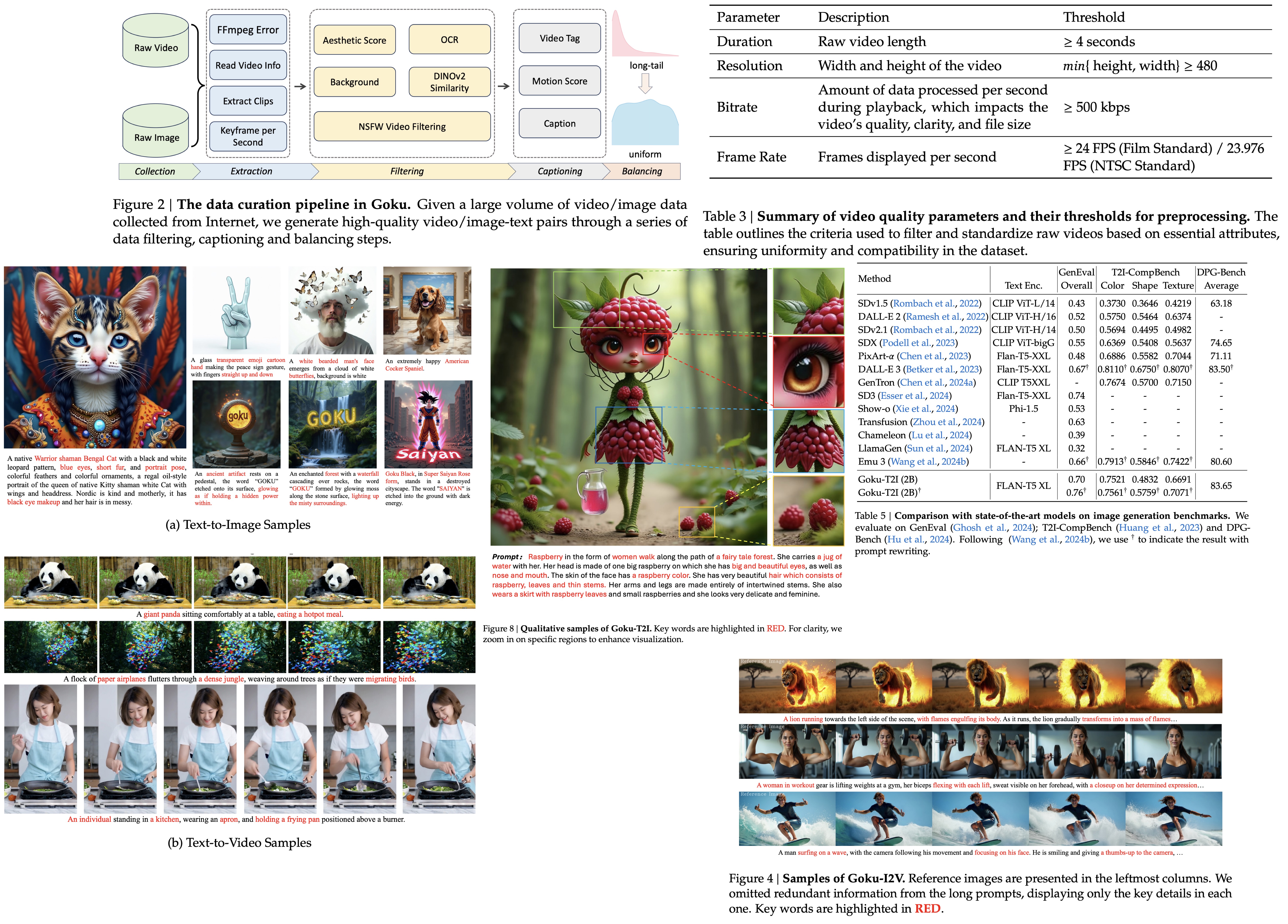 Goku is a family of joint image-and-video generation models built on rectified flow Transformers. The authors describe how they curate data, design the model architecture and flow formulation, and set up efficient large-scale training. The approach achieves 0.76 on GenEval and 83.65 on DPG-Bench for text-to-image generation, and 84.85 on VBench for text-to-video tasks - new SOTA results.