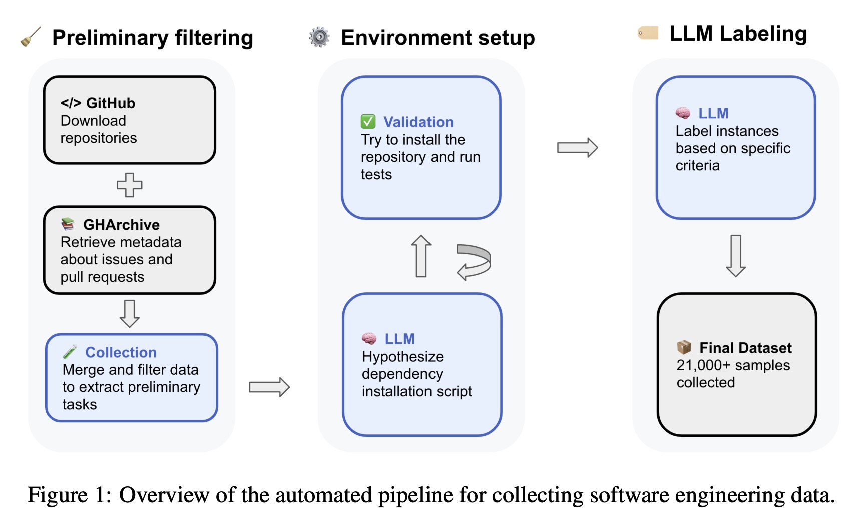 Raw data is collected from GitHub Archive and cloned GitHub repositories. ~450k pull requests were gathered from over 30,000 Python-dominant, permissively licensed repositories. Filtering selects only those where the issue is resolved by a merged pull request affecting 1–15 files, includes non-trivial descriptions, and adds or modifies test files. The resulting 153,400 task candidates each consist of two parts: the solution patch (code changes) and the test patch (test changes).