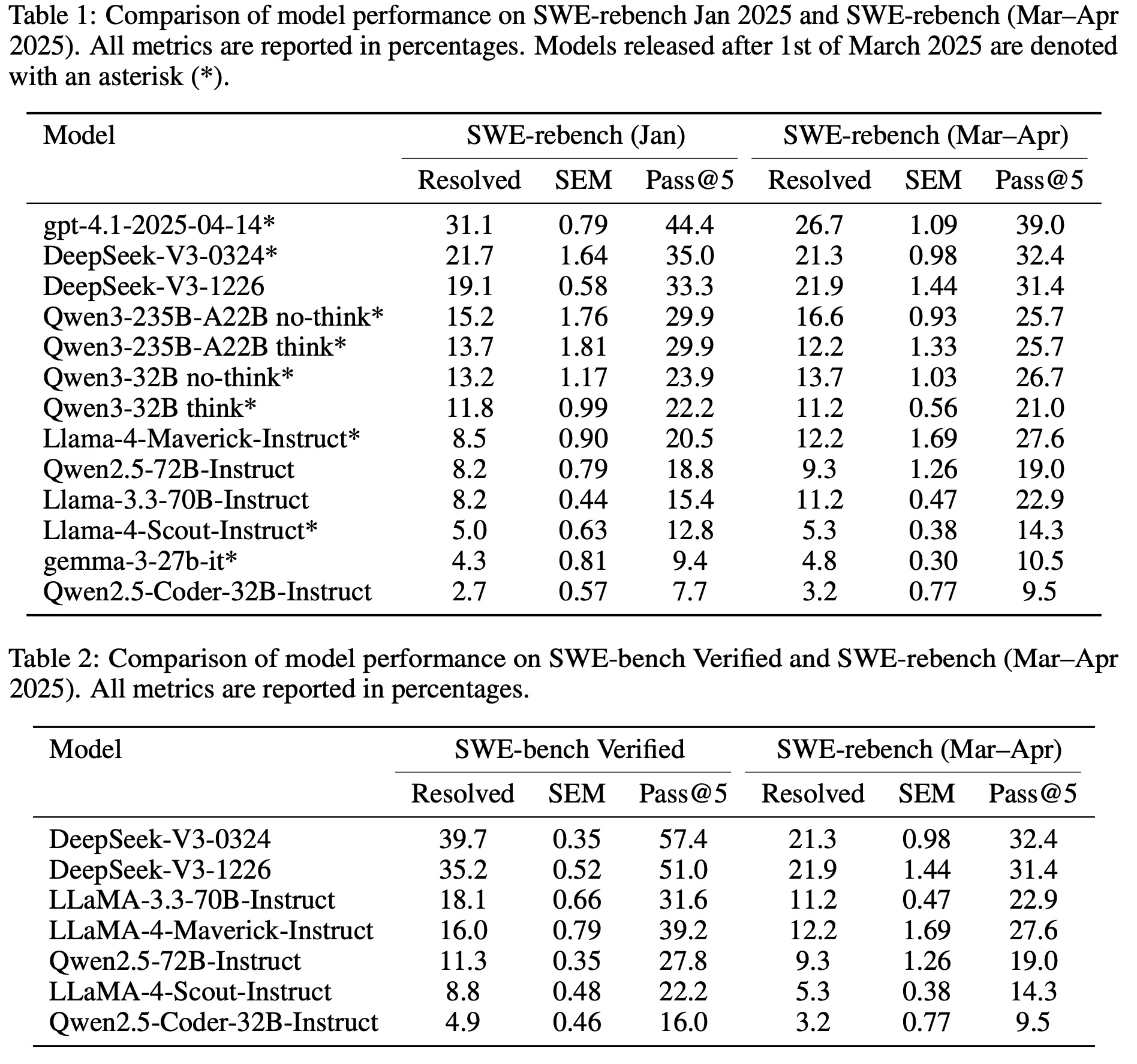 - DeepSeek-V3 models are the best-performing open-source models, maintaining top resolution and pass@5 scores across both SWE-rebench and SWE-bench Verified, demonstrating strong generalization.